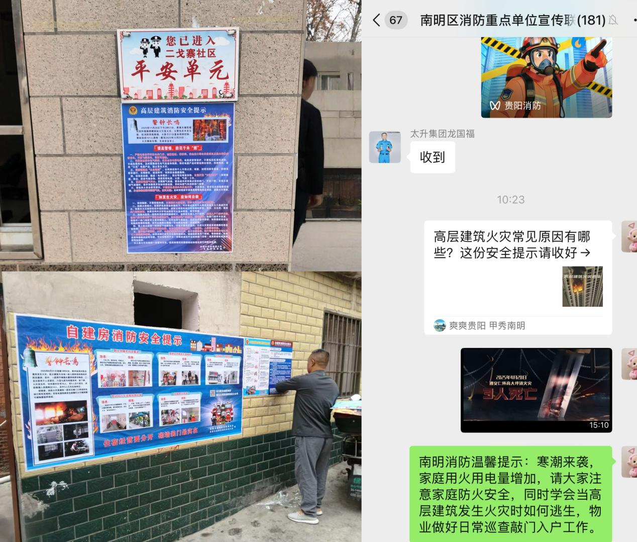 南明消防联动南明区融媒体中心制作《高层建筑火灾常见原因有哪些?这份安全提示请收好》等科普图文、短视频,通过各类平台广泛转发,扩大警示教育覆盖面,增强宣传针对性与感染力。发动全区物业公司依托小区小喇叭高频次播放消防安全提示音频,通过发放宣传手册、张贴海报等形式,宣讲防火常识,送上“流动安全宣传课”。