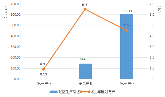 分产业看,第一产业增加值1326万元,增长0.9%;第二产业增加值144.53亿元,增长6.5%;第三产业增加值608.11亿元,增长4.5%。