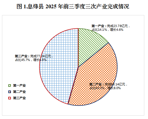 分产业看,第一产业增加值23.78亿元,增长4.6%;第二产业增加值68.14亿元,增长8.0%;第三产业增加值77.24亿元,增长4.9%。三次产业增加值占GDP的比重分别为14.1%、40.3%、45.7%。