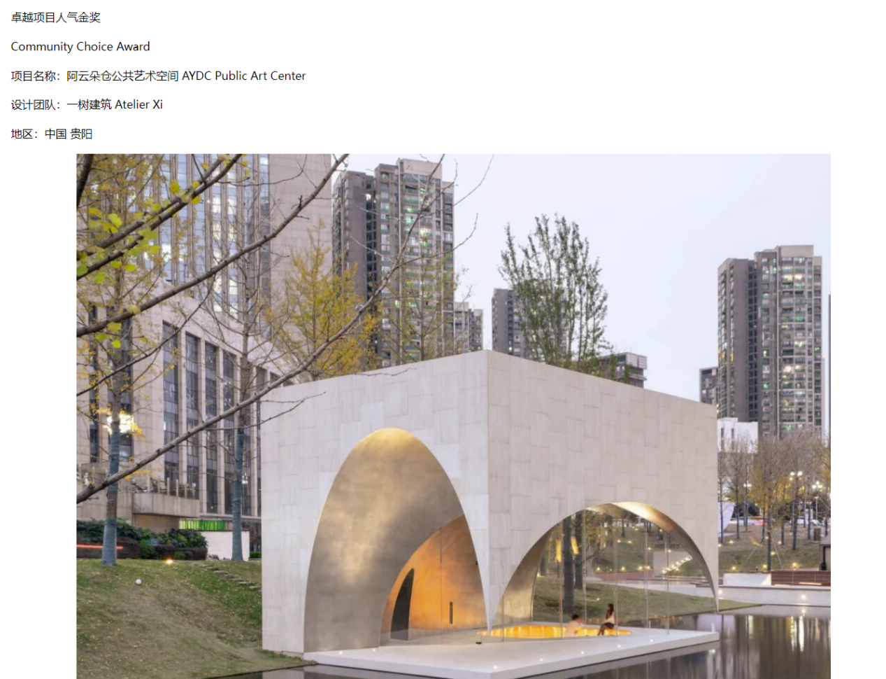 近日,在荷兰阿姆斯特丹揭晓了2025年度构架设计奖获奖名单。凭借现代艺术与贵州山水的融合设计,贵阳阿云朵仓公共艺术空间获得卓越项目人气金奖。