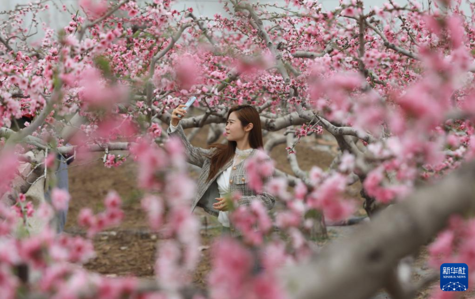 3月26日,一名游客在河南省焦作市温县黄河街道东张王庄村桃园赏花拍照。