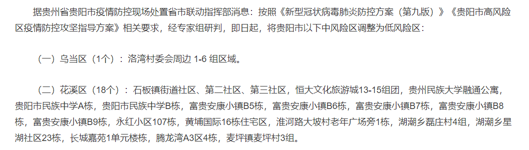 ▲贵阳市疫情防控现场处置省市联动指挥部消息,经专家组研判,23日起,将洛湾村委会周边 1-6 组区域、石板镇街道社区等19个中风险区调整为低风险区。