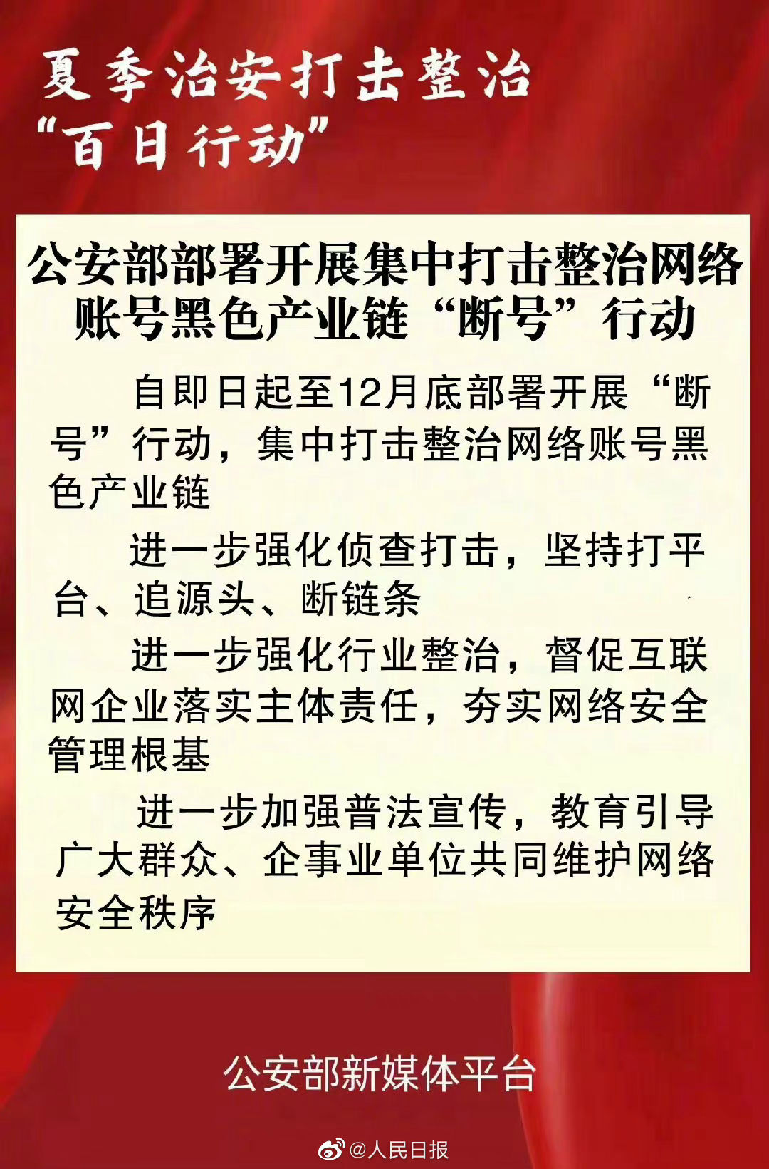 ▲公安部网络安全保卫局自即日起至12月底部署开展“断号”行动,集中打击整治网络账号黑色产业链。