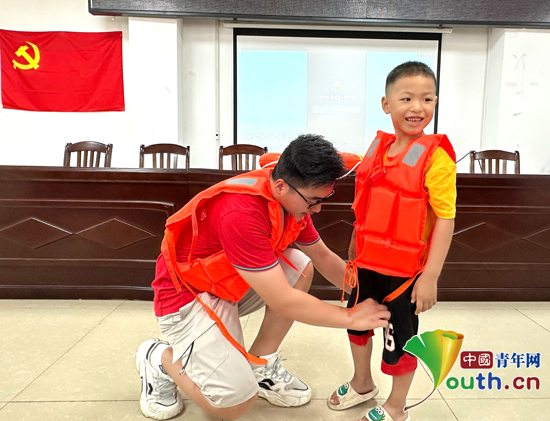 “会游泳就不会溺水?穿上救生衣就很安全?戴上游泳圈就能保命……”志愿者赵宇通过播放宣传视频警醒孩子们避开“溺水认识误区”,然后在“防溺能力我能行”环节中讲解了救生衣、救生圈的正确用法,带领孩子们动手体验,增强防溺水的相关应急防护能力。
