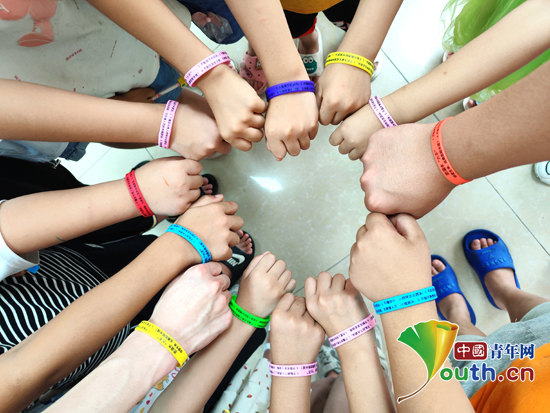 图为志愿者为孩子们佩戴防溺水宣传手环。郑州大学研支团供图