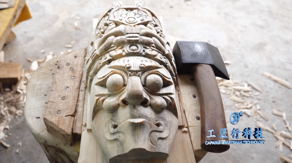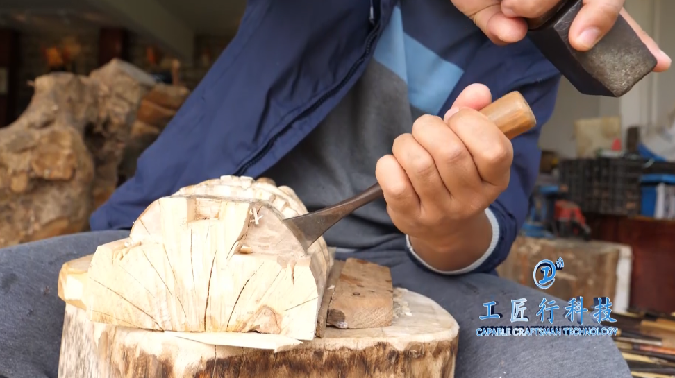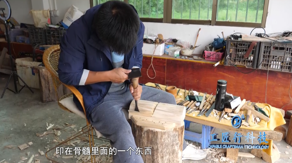 一块最简单的木头,需要鲍波运用到五十多把工具刀来雕刻,每天使用频率最高的,要数这把重达两斤半的锤头。