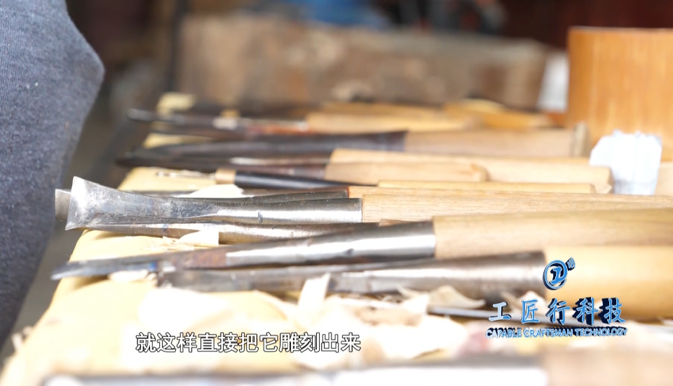 手艺人鲍波:根据我要雕刻的图案来选择工具刀。比如我在雕云朵的时候需要到哪一个宽度,就在大脑里面构思一下,需要多少寸的刀,直接把它雕刻出来。这些都是根据我们日日日夜积累的经验来判断的。