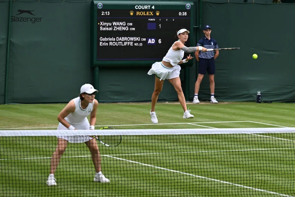 7月2日,王欣瑜/郑赛赛(左)在2025温网女子双打首轮比赛中。新华社记者 赵丁喆 摄