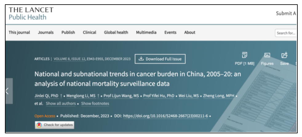 2023年12月,《柳叶刀-公共卫生》上刊发了由中国疾病预防控制中心慢病中心联合首都医科大学共同完成的“2005-2020年中国及分省癌症疾病负担研究”,研究指出,从2005年至2020年,中国癌症相关死亡人数增长了21.6%,肺癌、肝癌和胃癌仍是前三位死因。