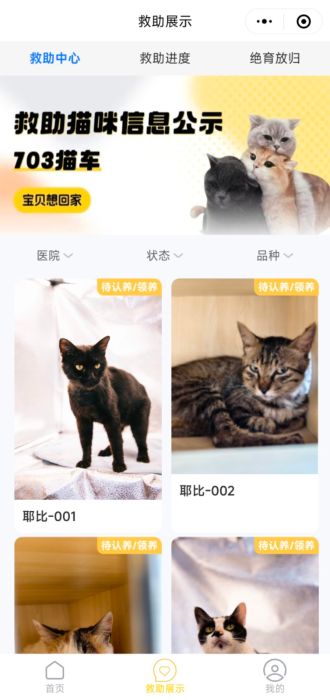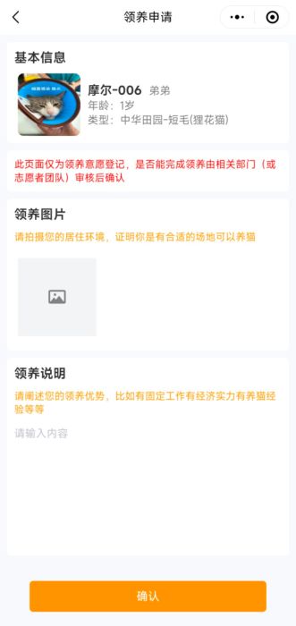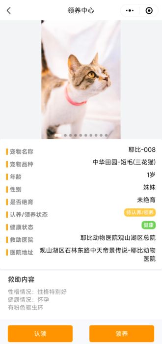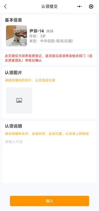为更好地帮助猫咪寻找主人,目前,该小程序已上线了新功能,在每个宠物的展示页面新增了“认领”和“领养”两个按钮。