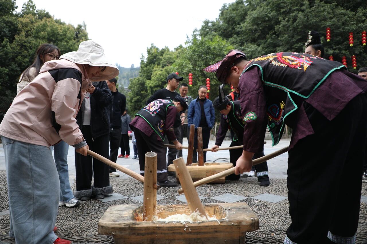 打糍粑挑战趣味十足,游客亲手捶打软糯糍粑,在木槌起落间感受侗寨民俗的热闹与温馨。