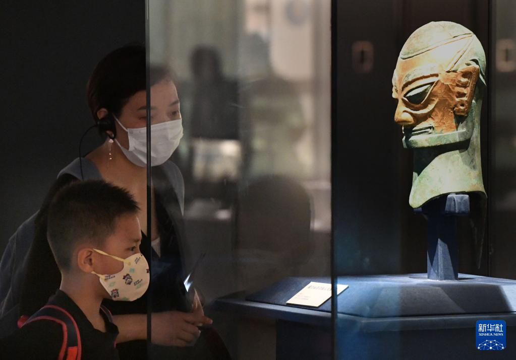 9月4日,参观者在“繁星盈天——中国百年百大考古发现展”上观看展品“戴金面罩青铜人头像”。新华社记者 李安 摄