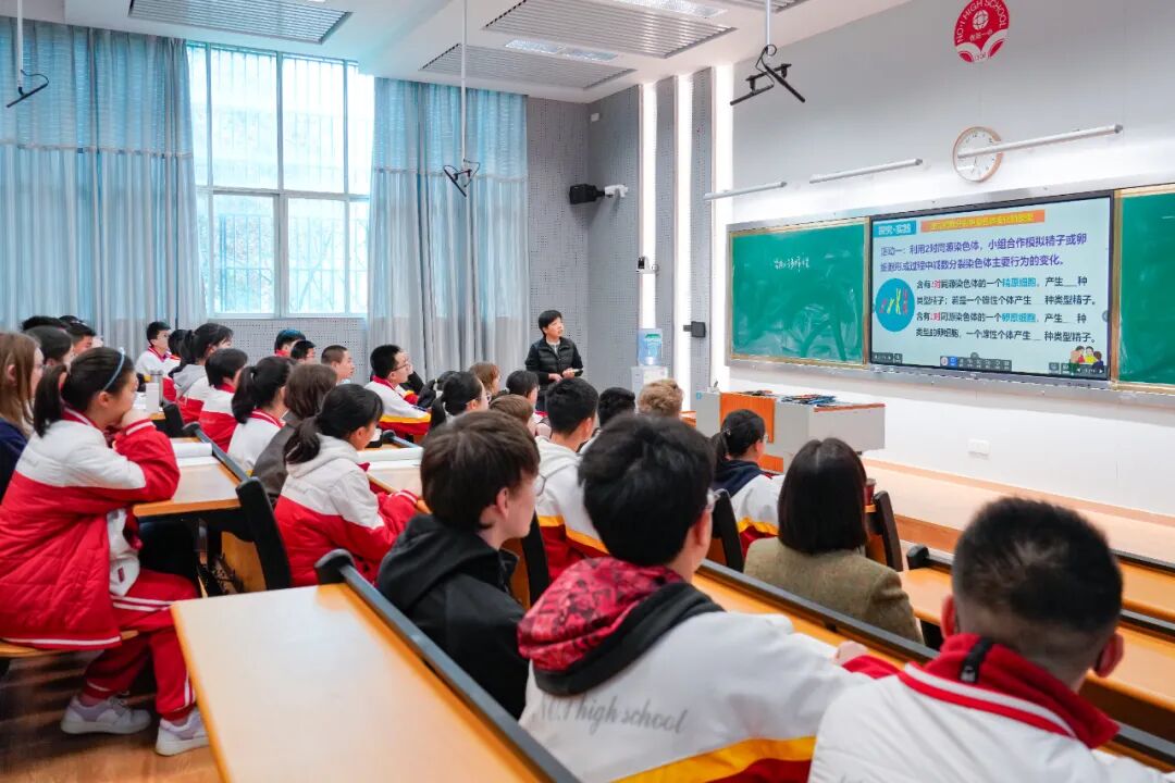 走进高一年级录播教室,沉浸式的课堂体验正式开启。德国学生跟随学伴融入生物课堂,与一中同学们并肩而坐,积极互动,感受中式课堂的独特魅力。