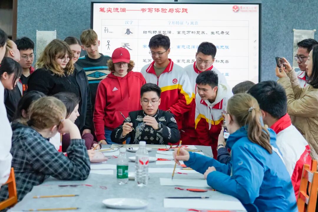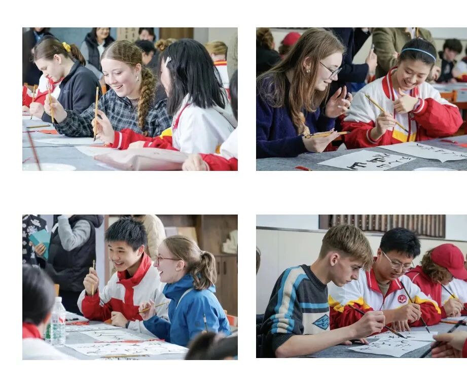 笔墨飘香传文化,汉字体验润心田。在科技楼美术教室,一场趣味十足的中国书法体验课如约开展。陆耸老师现场示范,带领德国师生执笔书写汉字,耐心讲解汉字的字形,让德国师生了解到中国文化。大家认真临摹,在一撇一捺间感受中华汉字的形韵之美。亲手书写的汉字作品,成为他们此次中国之行的珍贵文化纪念。