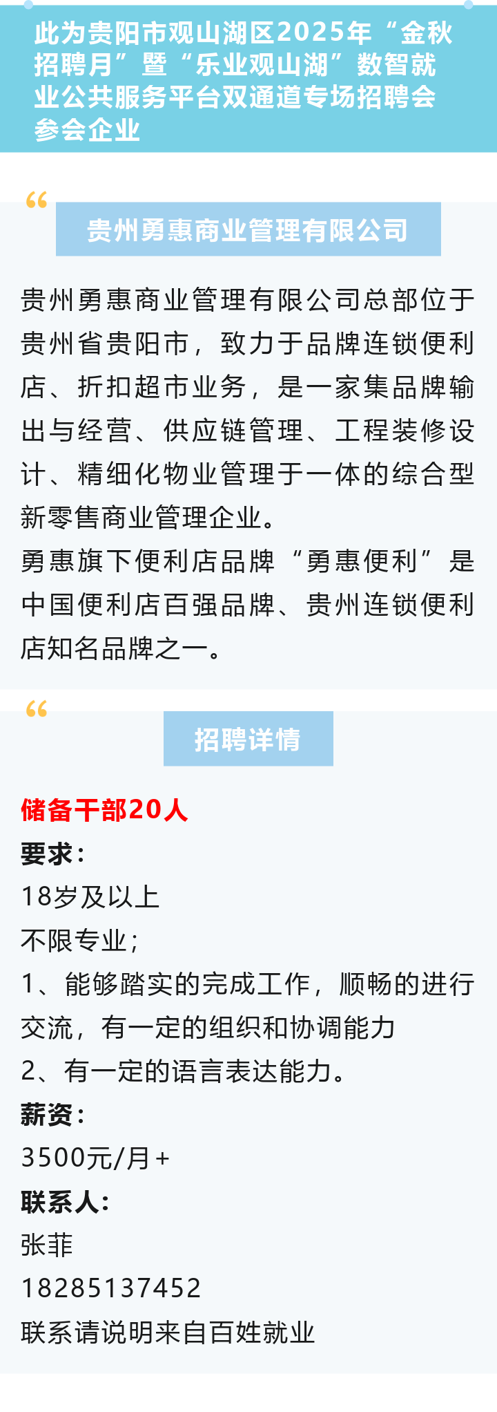 【知名企业】贵州勇惠商业管理有限公司招聘储备干部20人!