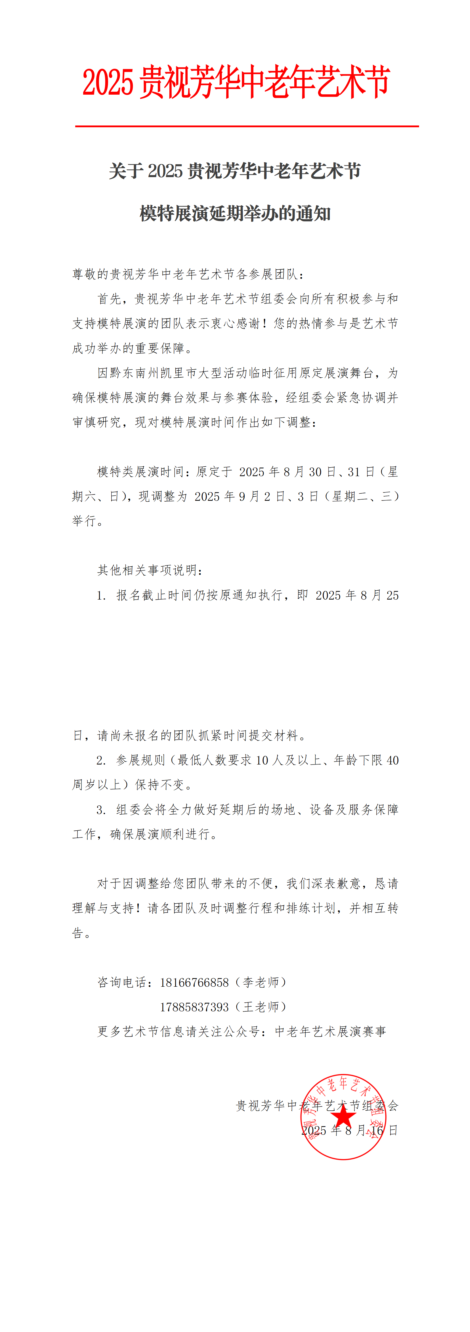 关于2025贵视芳华中老年艺术节模特展演延期举办的通知