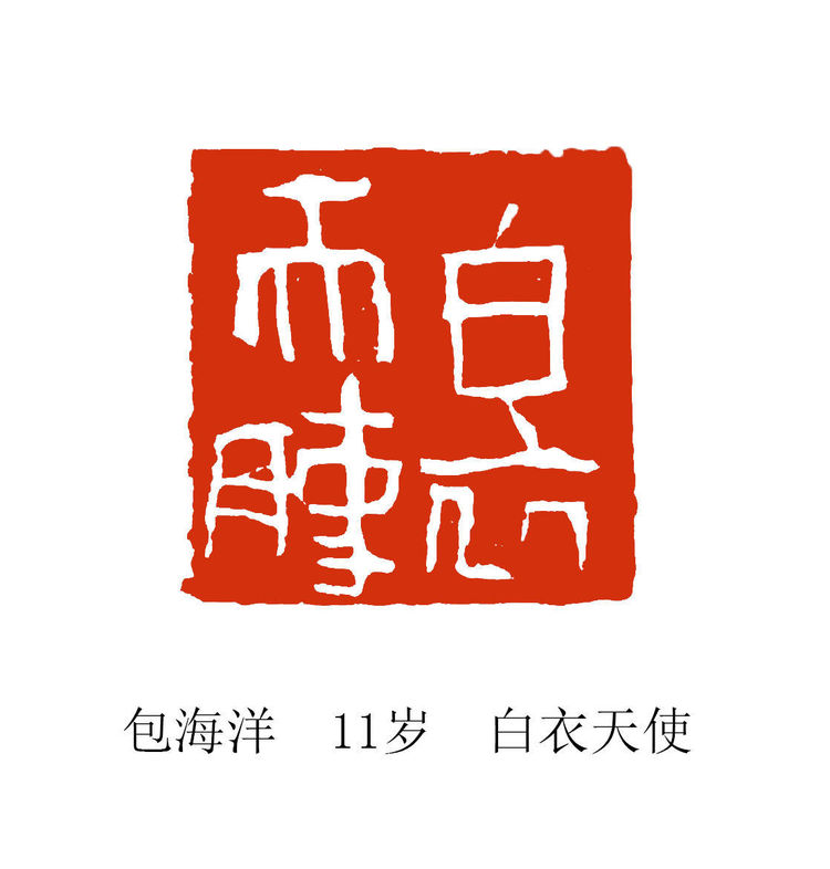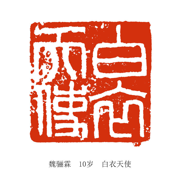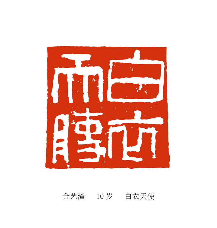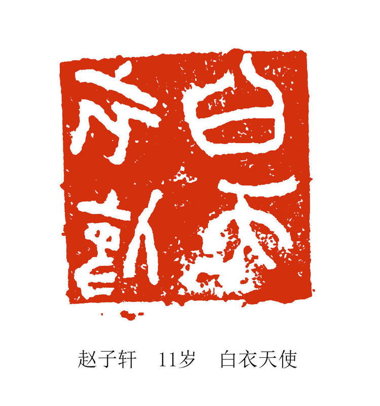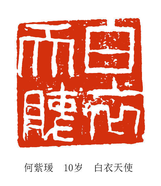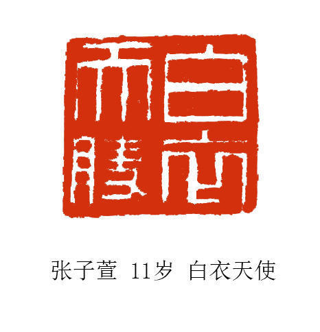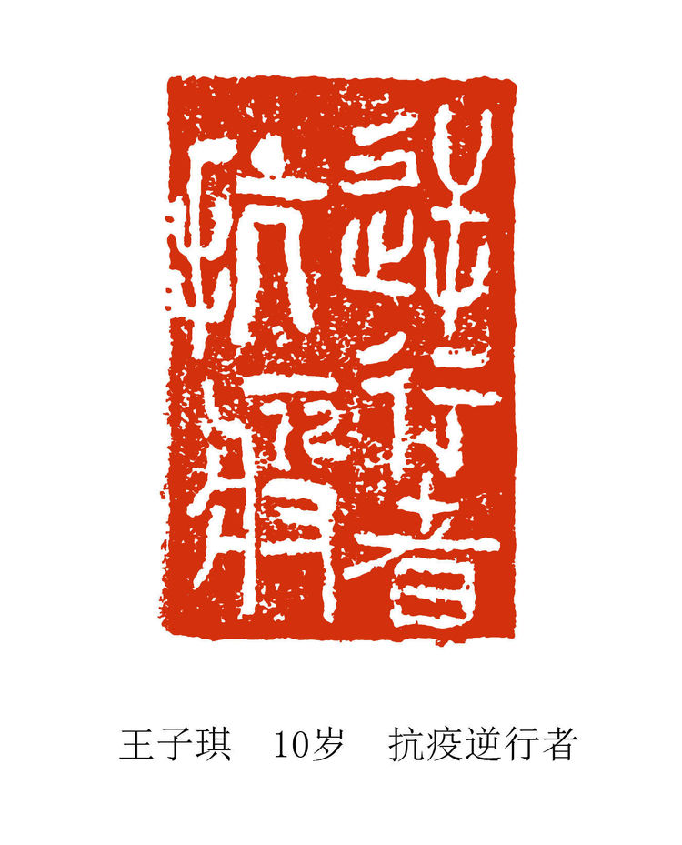 (金艺潼同学把“白衣天使”印章刻完后印在护士的身上,以助力防疫一线工作者)