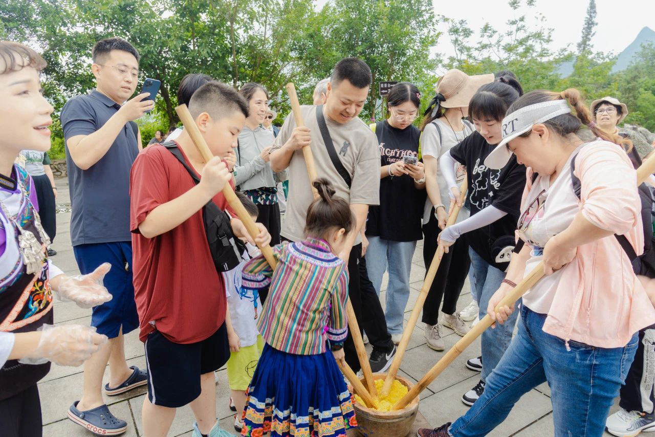 6.糍旧迎新 平安喜乐:在将军峰广场游客服务中心门前,游客免费体验打糍粑。
