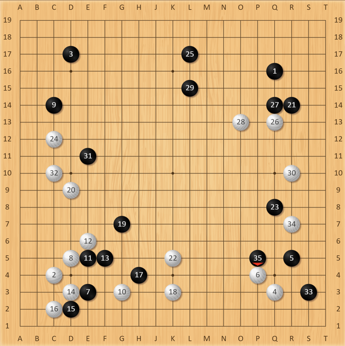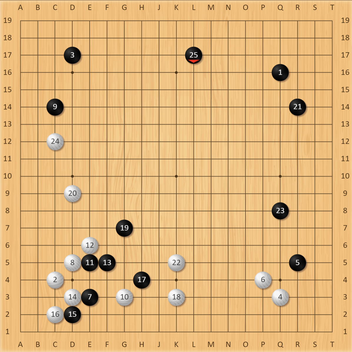 布局行至黑25手,黑白都搭起了自己的阵势,感觉互相熟悉的双方都准备好了一场持久战。
