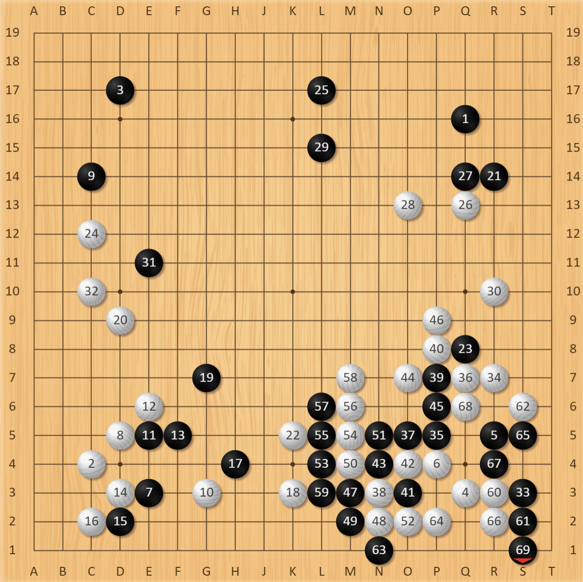 如图,黑棋实惠吃掉下方白棋,并使白棋外围防线有所缺陷,AI分析胜率将会回归到初始状态,大家又回到了同一起跑线。