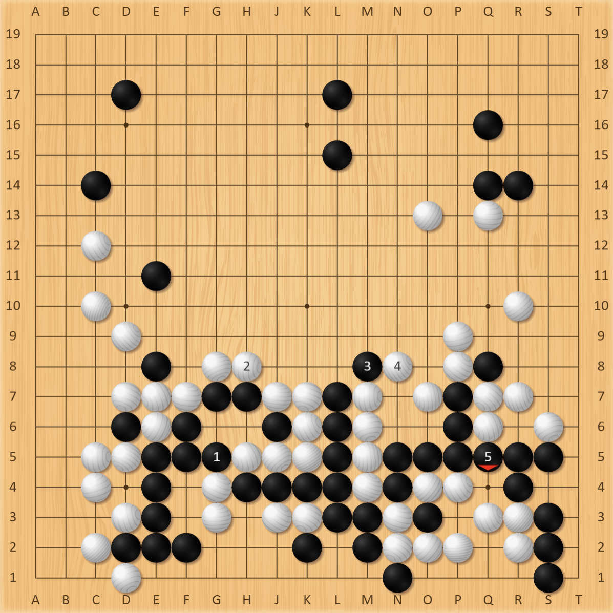 行至白94手,此时王星昊面临着两个选择,第一个是在G5处切断白棋,第二个是在H8处冲出。如若是从G5处切断,大致会形成以下变化。