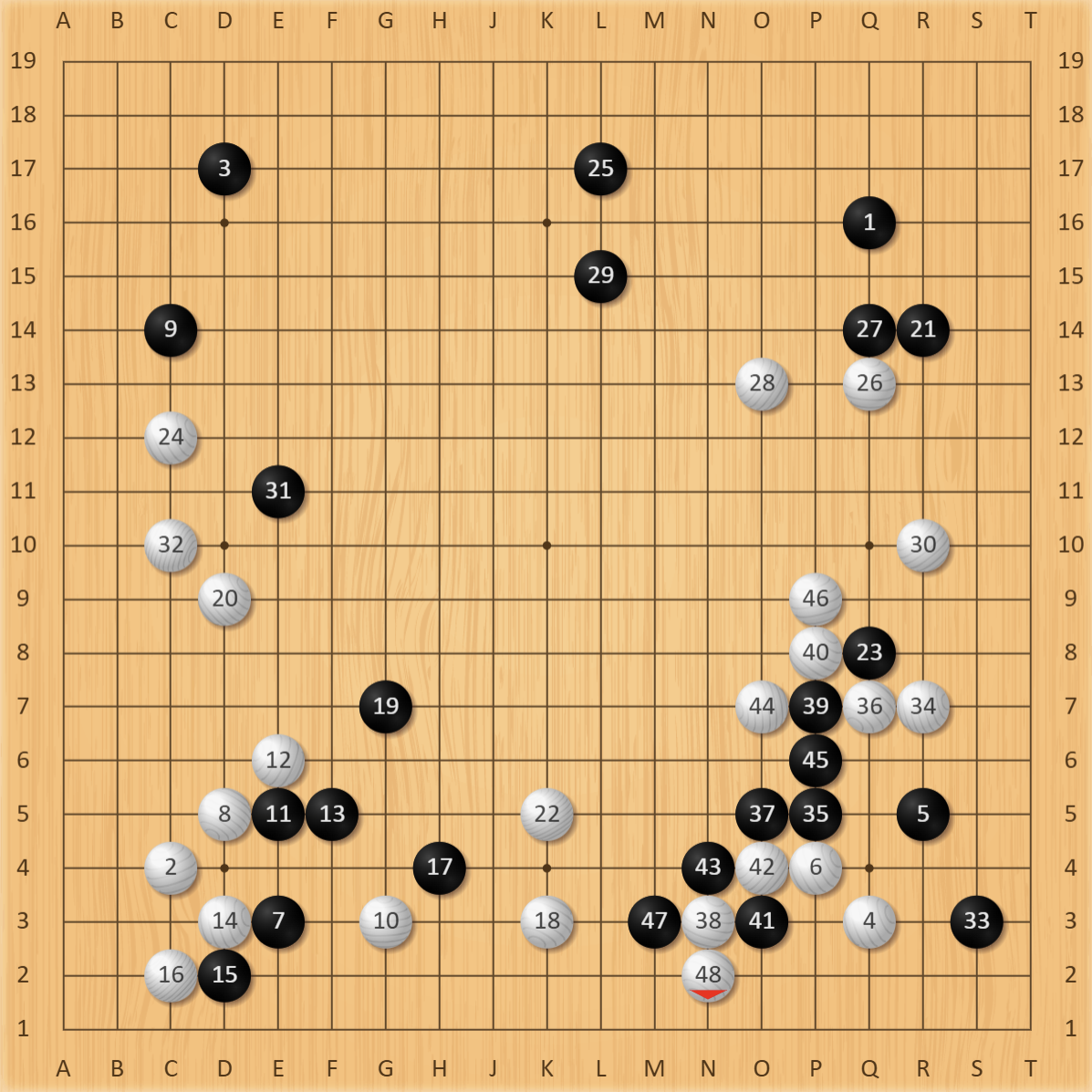丁浩白36手往上冲出,黑37手继续挺出,行至白48手,白棋切下黑右边上一子,收获了边上整体的稳定和不少实空,黑棋意在破坏白下边阵势,但自身断点颇多,AI分析此时黑棋胜率进一步下跌了10%,只剩20%左右。接下来看王星昊如何处理?