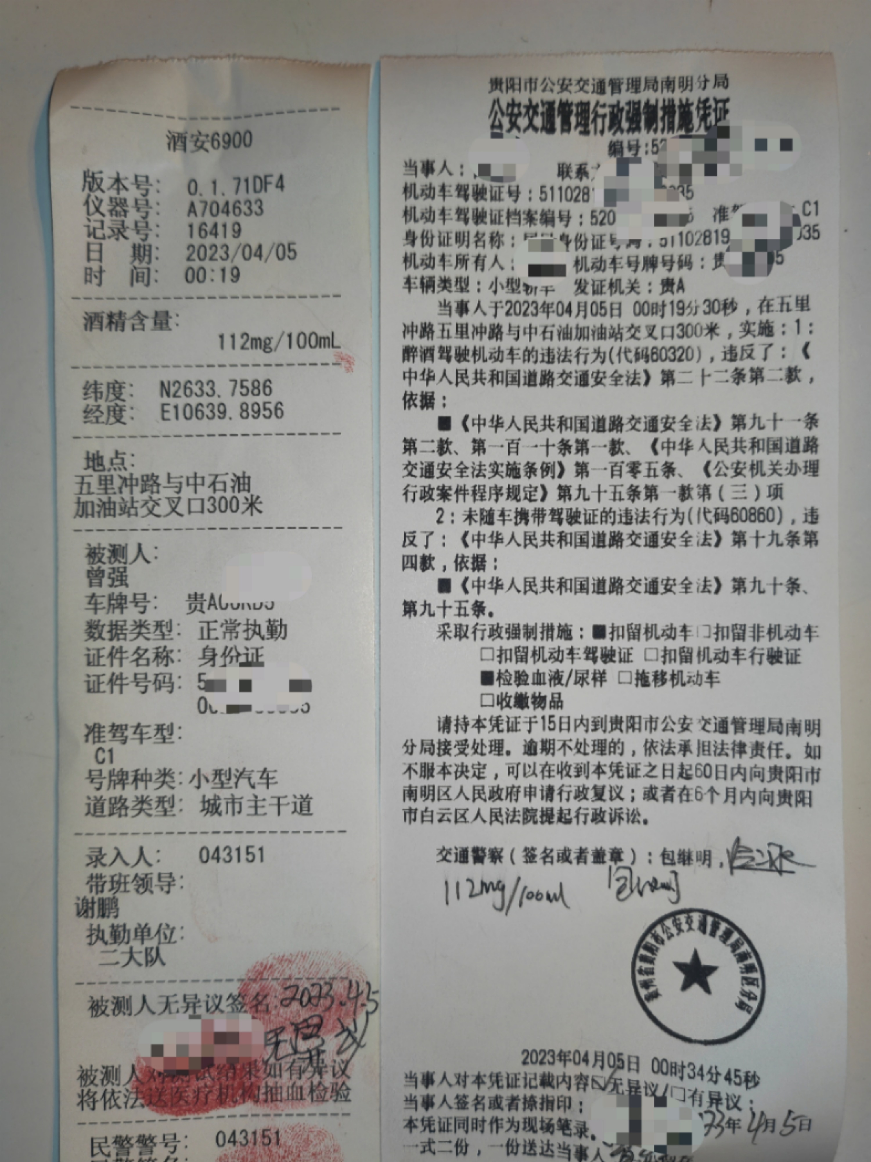 通过呼气式酒精检测,检测结果为112mg/100mL,曾某涉嫌醉酒后驾驶机动车的违法行为。面对铁证,他果断改口承认自己酒后驾车上路行驶的违法事实。他说当天自己与妻子闹情绪,在观山湖区喝酒以后找了代驾开车回到了南明区家中,然后自己情绪不佳又开车出来,才开出500米左右被查。