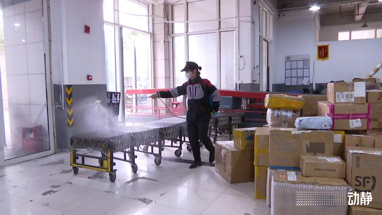 在金利大厦顺丰点位,站内已经被各类快件填满,快递小哥正在进行货物分拣、场地消杀等工作。据点位负责人介绍,站上每天进出的快递他们都会进行三次消杀。