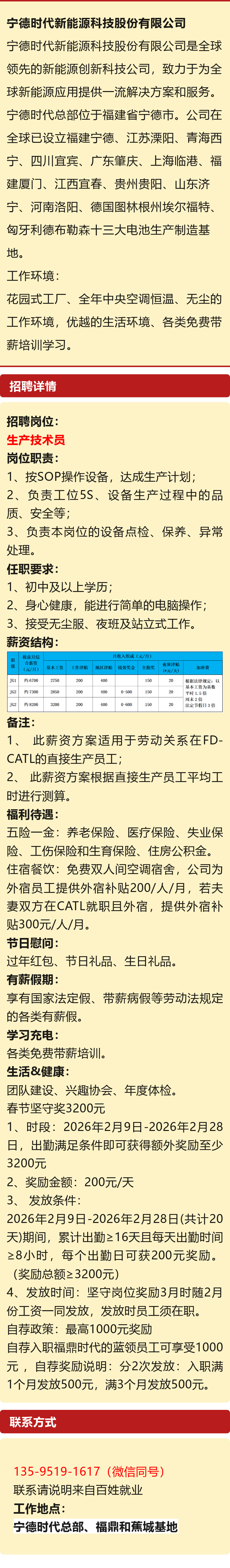 宁德时代招聘!综合月薪6700~8200元!五险一金!免费宿舍!另春节留任奖至少3200元!员工自荐奖最高1000元!