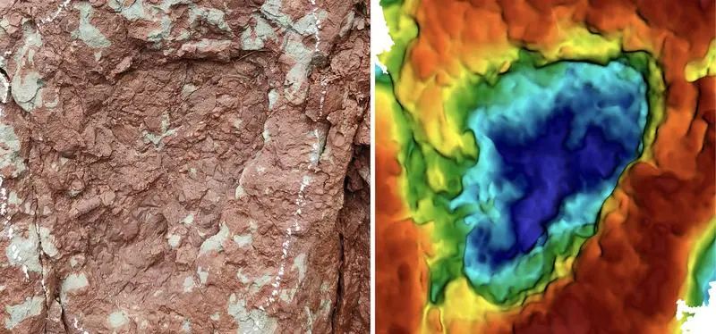 在西藏昌都市冻多村发现的小型蜥脚类恐龙足迹与3D图像。(受访者供图)