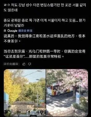该博文显示,该韩国博主的原帖共附有两张照片,名先生的作品为第二张。帖文的大意为,博主认为江南、圣水(洞)等地并不像首尔,而当人们走到宗庙、光化门和钟路一带时,才会觉得“这就是首尔”,并称赞那里的氛围很特别。