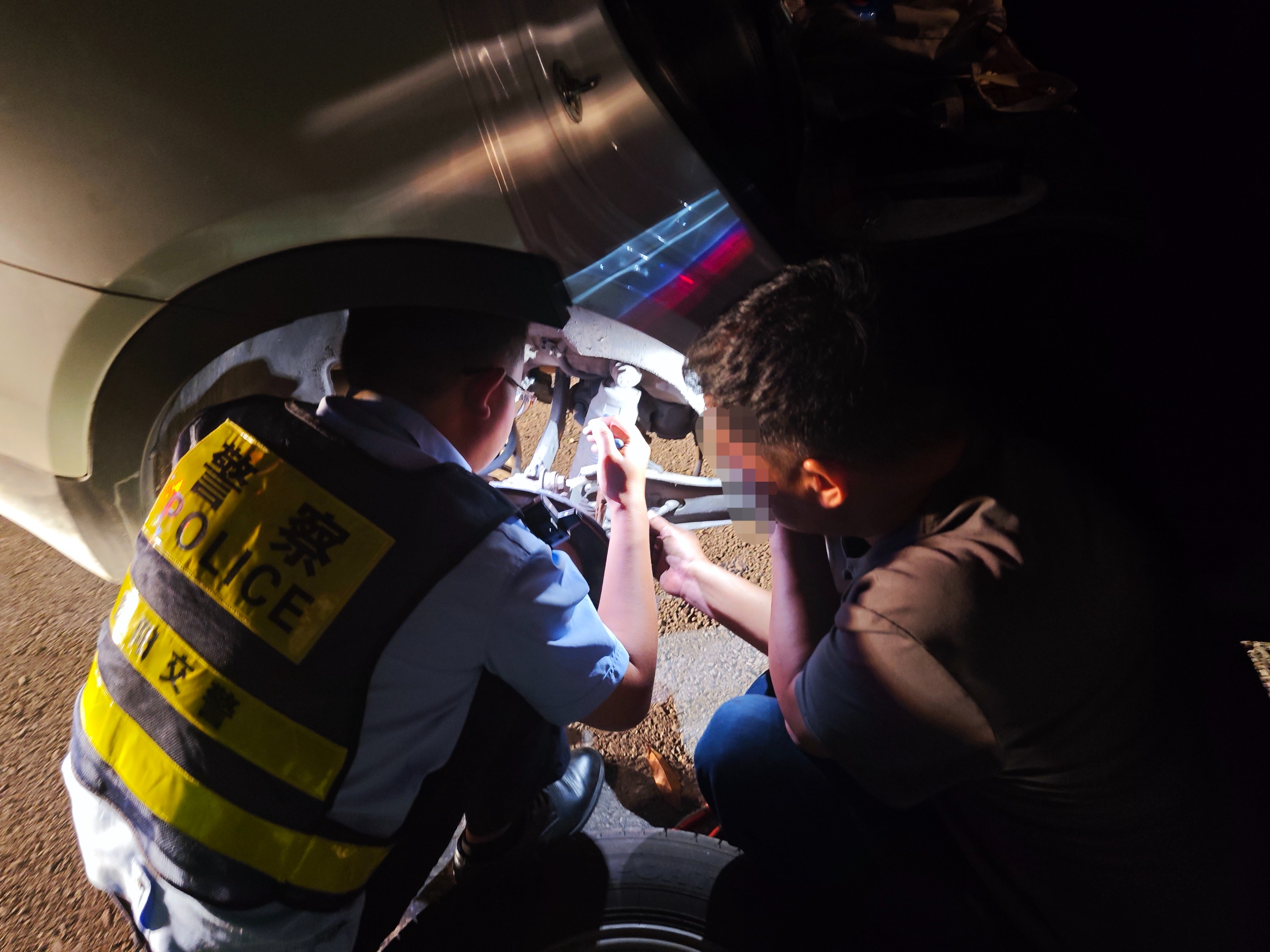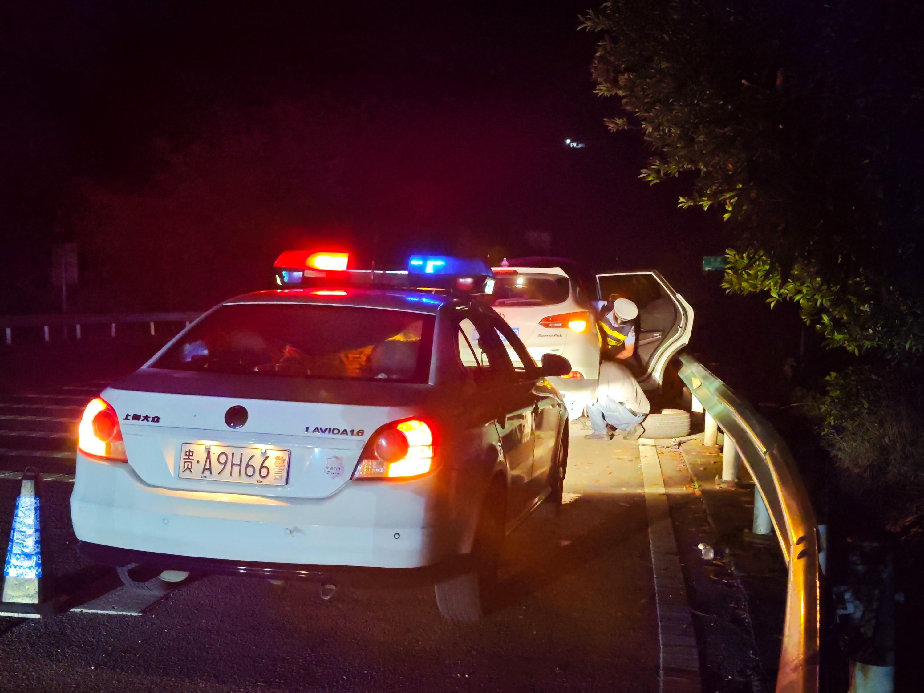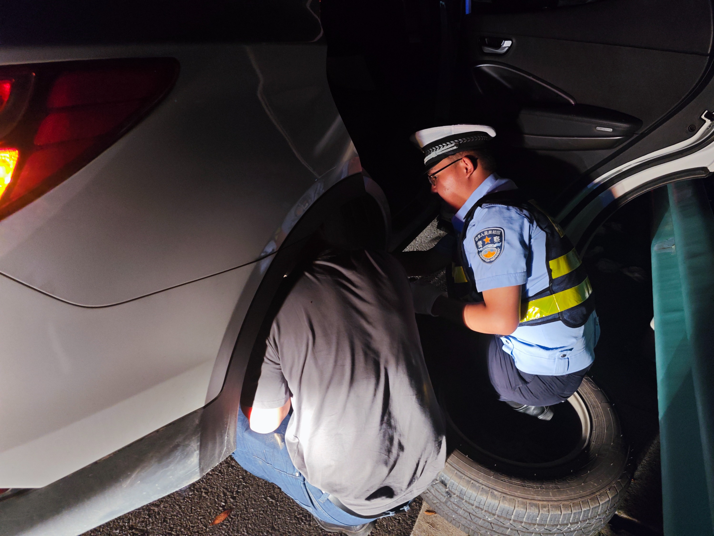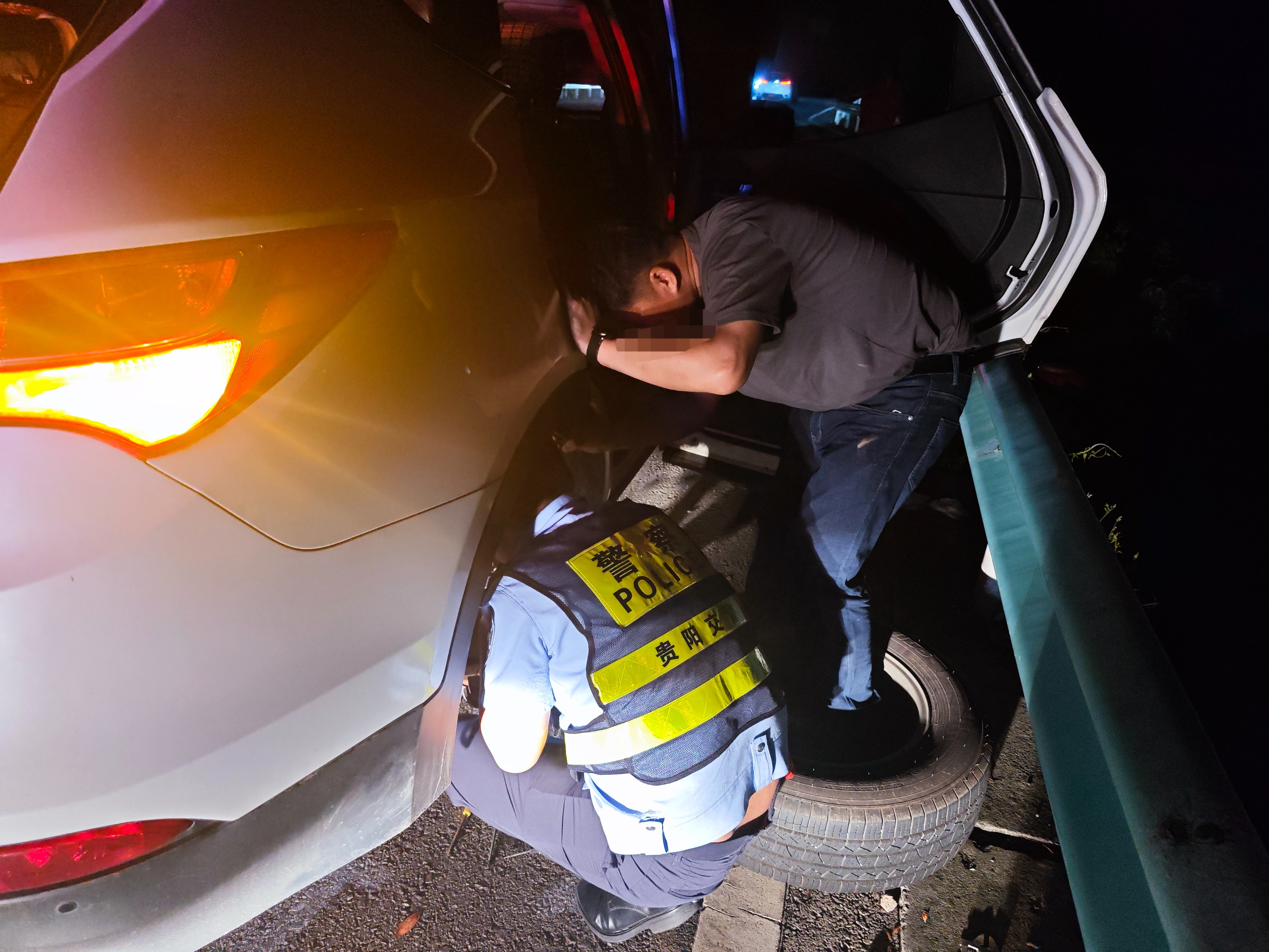5月20日晚上21点,正在云开二级公路巡逻的乌当交警二中队民警涂文虎和辅警陈文亮发现,在云开二级公路一长下坡路段的应急停车带上,停着一辆打着双闪的越野车。