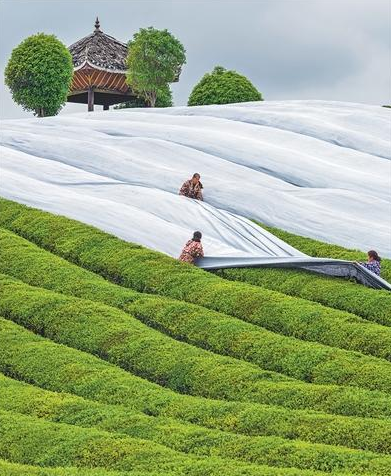 4月12日,贵州省黔东南苗族侗族自治州黎平县高屯街道桂花台茶园里,村民给茶叶盖上遮阳网。