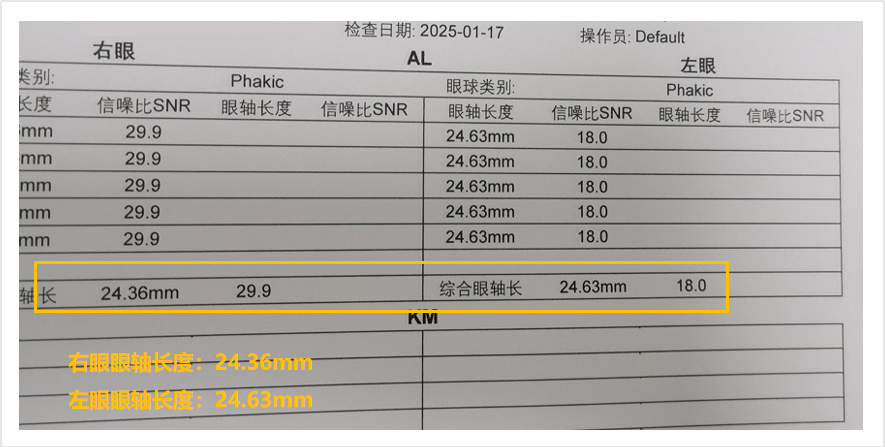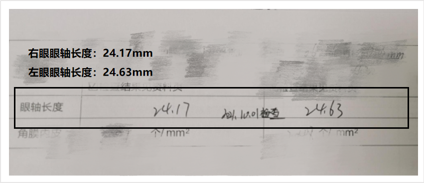 2021年,10岁的小琳因视力下降就诊时,医生先通过各项专业设备做了全面检查:右眼眼轴24.17mm、左眼眼轴24.63mm——这个数值远超同龄儿童正常范围,意味着小琳不仅已有近视,还面临未来发展为高度近视的风险(高度近视可能伴随视网膜脱离、黄斑病变等并发症)。