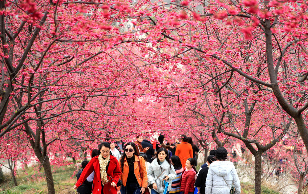游客在浙江省瑞安市桐浦镇桐浦凤凰樱花谷游玩赏花。新华社发(孙凛摄)