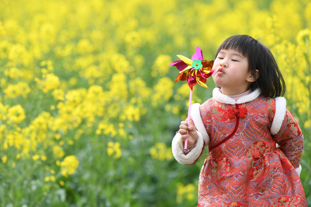 一名小朋友在贵州省余庆县白泥镇满溪村的油菜花田间玩耍。新华社发(贺春雨摄)