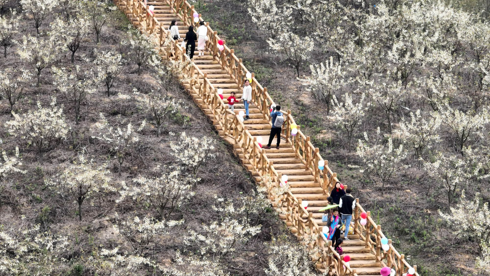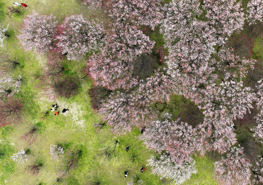 早春时节,随着气温回暖,我国南方多地鲜花开放。人们走出家门,踏青赏花,乐享春日时光。 2月18日,游客在广西柳州市鹿寨县导江乡山楂林中赏花休闲(无人机照片)。新华社发(黎寒池摄)