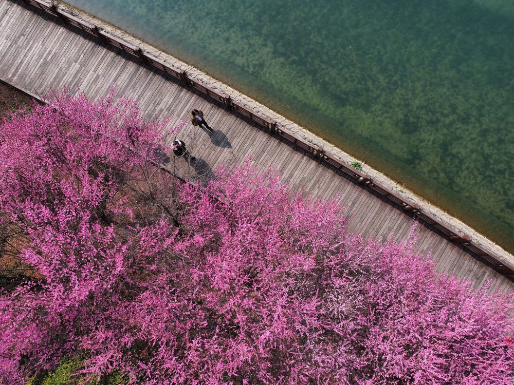 居民在贵州省施秉县河滨公园赏花漫步(无人机照片)。新华社发(梁文摄)