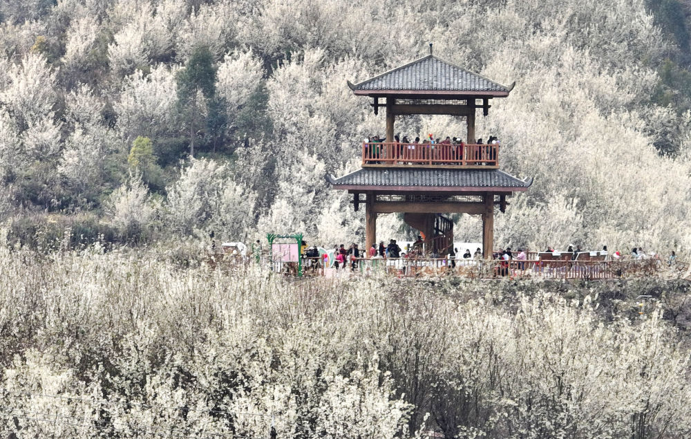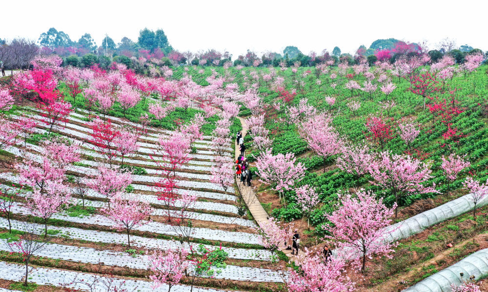 游客在四川省泸州市江阳区丹林镇建设村樱花谷景区游玩。新华社发(刘学懿摄)