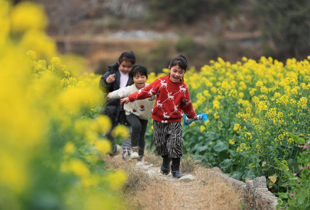 小朋友在贵州省从江县洛香镇上皮林村的油菜花田间玩耍。新华社发(罗京来摄)