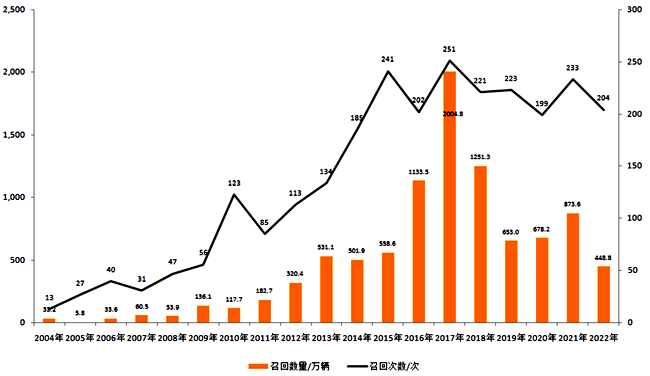 2004-2022年汽车产品召回的次数与数量。图片来源:市场监管总局
