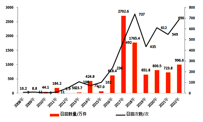 2008-2022年消费品召回的次数与数量。图片来源:市场监管总局