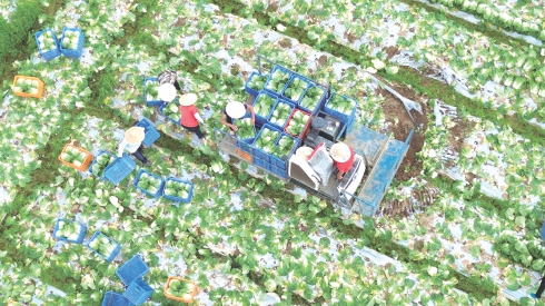 近年来,广西壮族自治区贺州市充分利用毗邻粤港澳的地缘优势,打造粤港澳大湾区“菜篮子”工程,每年约七成农产品供应到大湾区市场,促进当地农民就业致富。图为当地菜农抢抓农时采收蔬菜供应市场,田间地头一派忙碌景象。廖祖平 摄(来源:大国三农)
