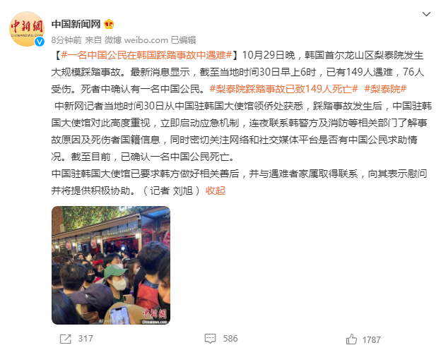 截至目前,韩国首尔踩踏事故中已有两名中国公民遇难。