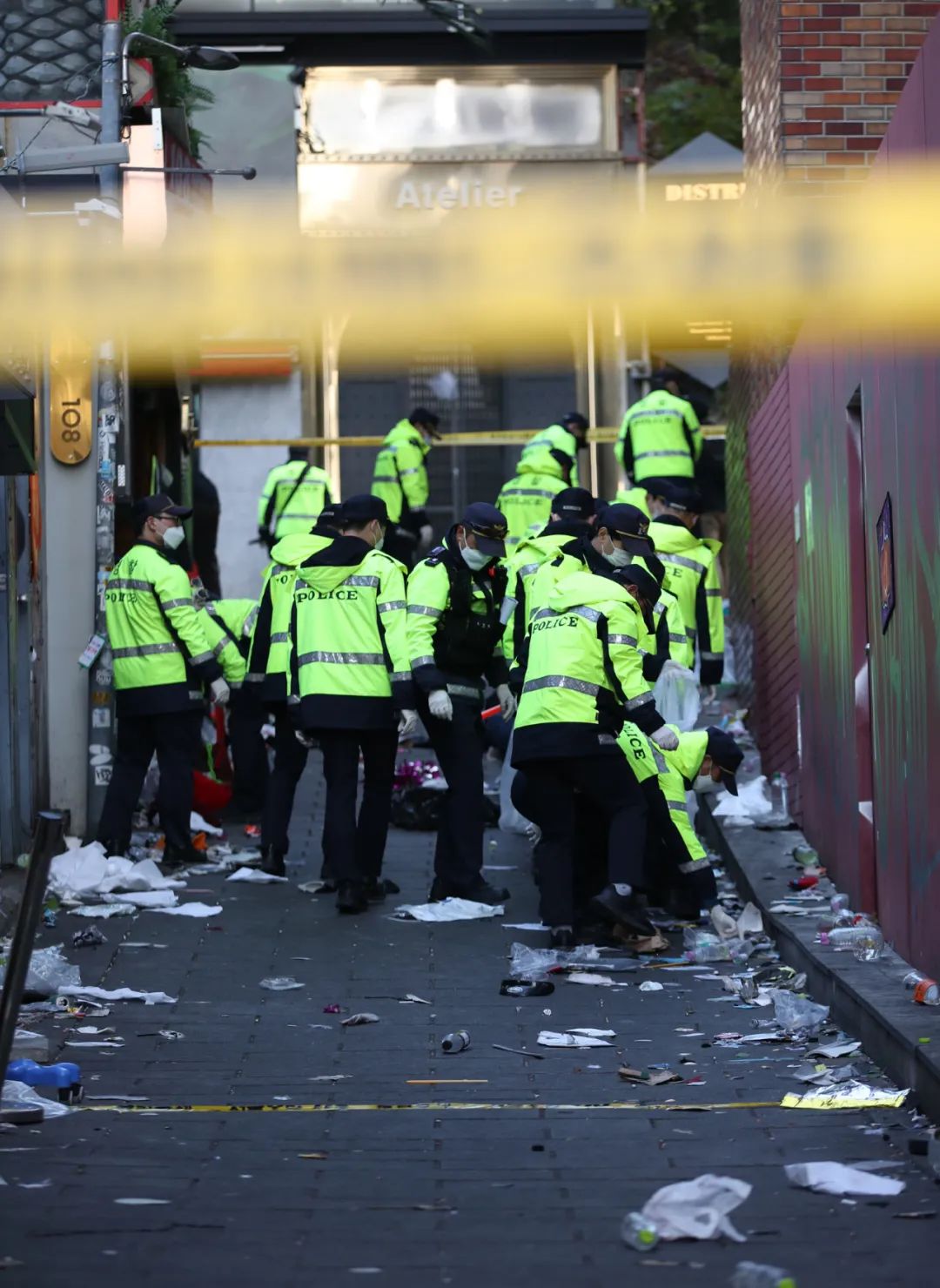 当地时间2022年10月30日,韩国首尔,首尔梨泰院发生踩踏事故,警方在现场进行调查。澎湃影像 图