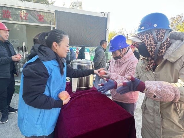 驻津央企中铁四局三公司生态城项目团支部近日开展了“情系工地,姜汤送暖”志愿服务活动,组织青年志愿者为产业工人和管理人员送上苹果和姜汤。