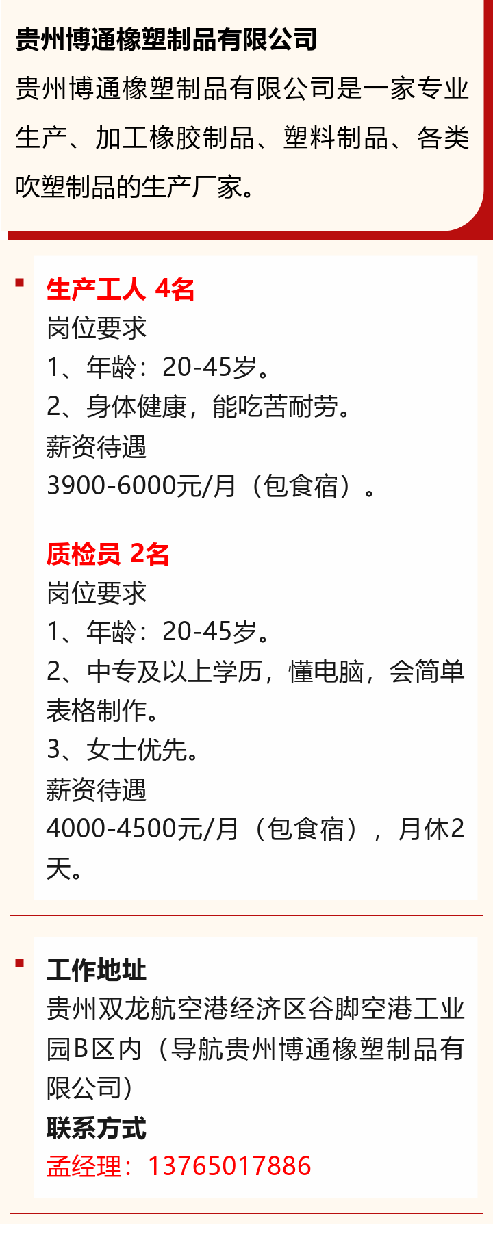 贵州双龙航空港经济区招聘生产工人、质检员 !包食宿!