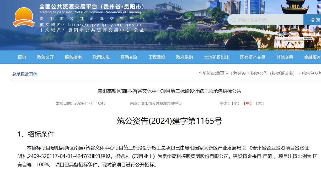 11月11日,贵阳市公共资源交易中心官网发布贵阳高新区南园•智谷文体中心项目第二标段设计施工总承包招标公告。该招标项目已由贵阳国家高新区产业发展局以 《贵州省企业投资项目备案证明》,2409-520117-04-01-424783批准建设,招标人(项目业主)为贵州高科控股集团股份有限公司,建设资金来自自筹,项目出资比例为国有自筹100%。 项目已具备招标条件,现对该项目进行公开招标。