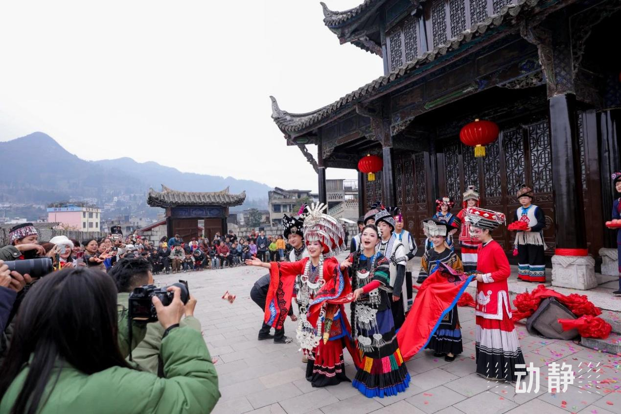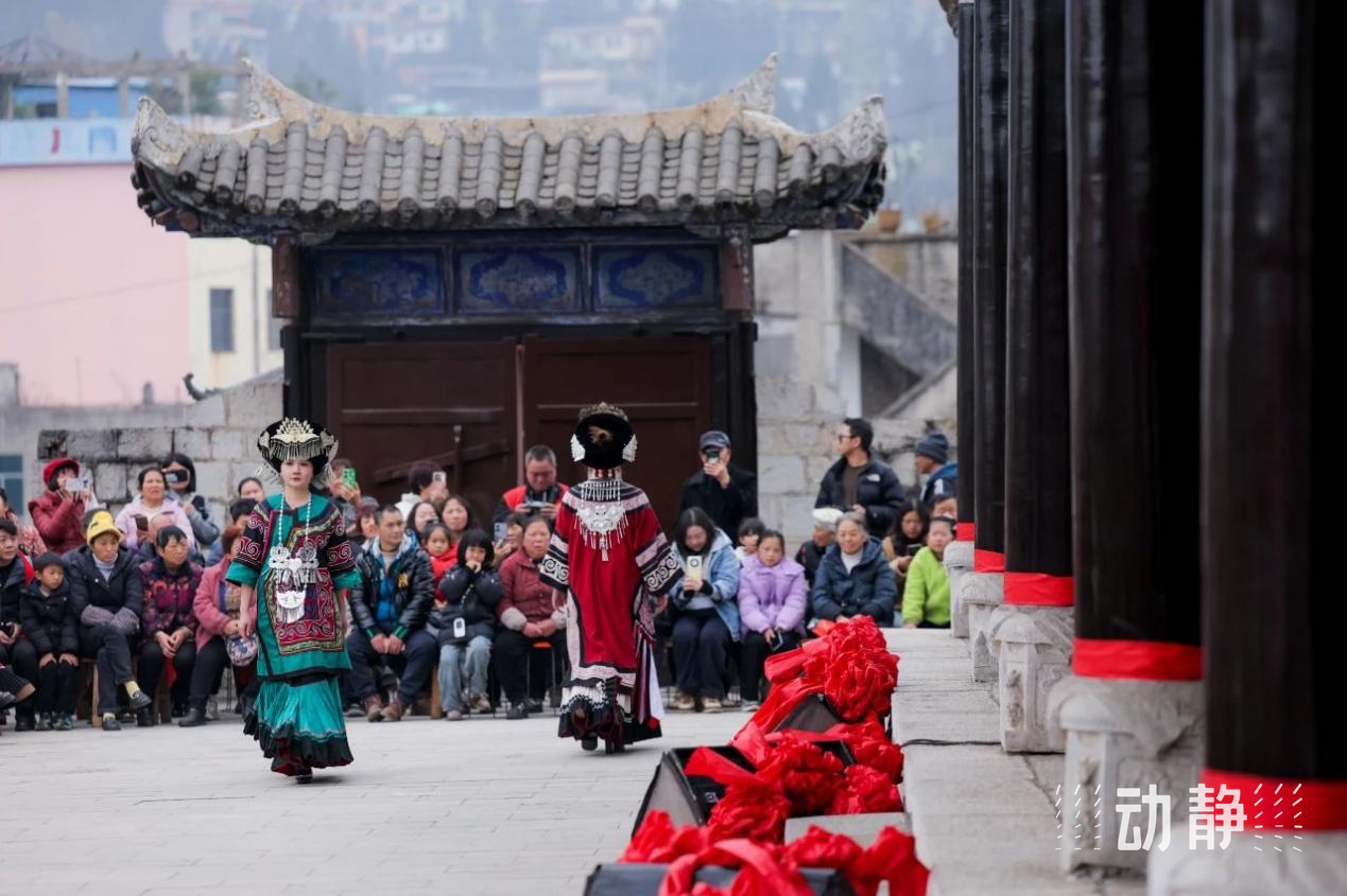 1月19日,“乌蒙村秀·古城新年”活动在六盘水盘州市双凤镇古城门楼激情上演,独特的彝族传统文化与创新融合之美,吸引了众多游客观赏。