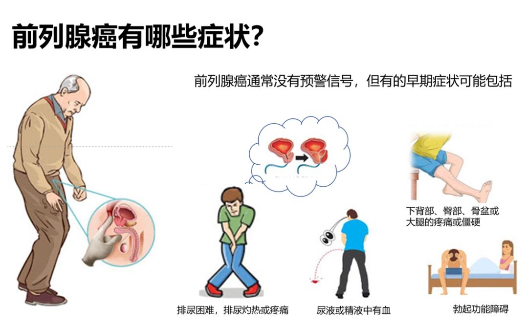 当前列腺癌出现症状时,主要表现为排尿障碍,如尿频、排尿时间延长等。这些症状也常见于良性前列腺增生患者,所以常有患者把前列腺癌的早期症状和前列腺炎、前列腺增生混淆在一起,从而放任病情恶化。等出现明显症状时,前列腺癌往往已经发展到晚期了。